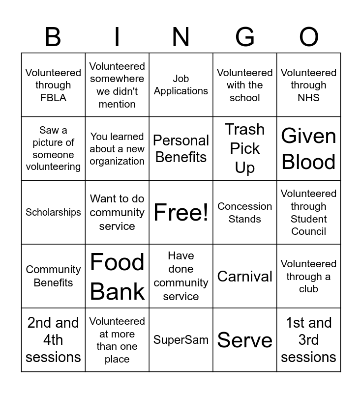 This bingo card has a free space and 24 words: Food Bank, Volunteered at more than one place, Personal Benefits, 2nd and 4th sessions, Volunteered through NHS, Volunteered through FBLA, Saw a picture of someone volunteering, Volunteered somewhere we didn't mention, Concession Stands, Have done community service, Trash Pick Up, Scholarships, Carnival, Volunteered through a club, You learned about a new organization, Serve, Volunteered through Student Council, Job Applications, Given Blood, Want to do community service, 1st and 3rd sessions, Community Benefits, Volunteered with the school and SuperSam.