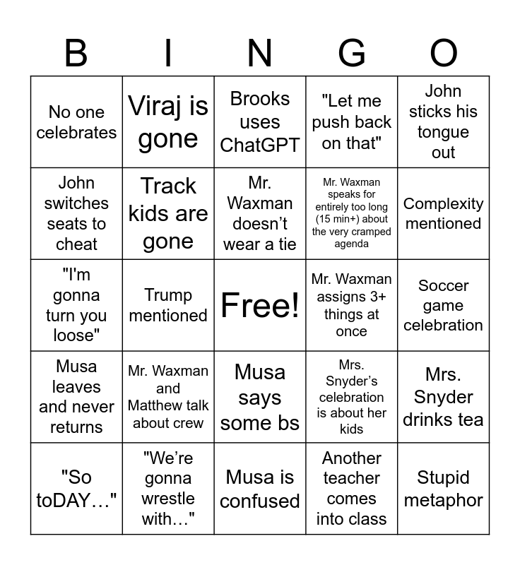 This bingo card has a free space and 27 words: Mrs. Snyder’s celebration is about her kids, Mr. Waxman mentions a former student, Mr. Waxman speaks for entirely too long (15 min+) about the very cramped agenda, Musa is confused, John switches seats to cheat, Brooks uses ChatGPT, Viraj is gone, Musa leaves and never returns, Mr. Waxman assigns 3+ things at once, Mrs. Snyder drinks tea, "I'm gonna turn you loose", "Let me push back on that", "So toDAY…", "We’re gonna wrestle with…", Complexity mentioned, Baked goods, Track kids are gone, Mr. Waxman doesn’t wear a tie, Mr. Waxman and Matthew talk about crew, No one celebrates, Soccer game celebration, Another teacher comes into class, Trump mentioned, Stupid metaphor, Musa says some bs, John sticks his tongue out and Mr. Waxman mentions his kids.