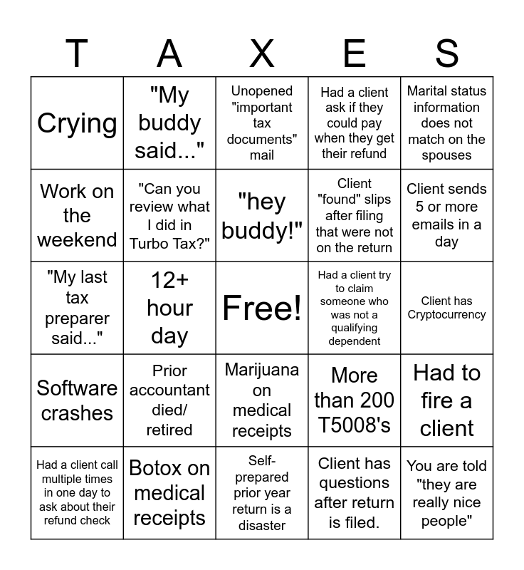 This bingo card has a free space and 43 words: Client provides time sensitive notice late, 12+ hour day, "My taxes are not that complicated", Client has questions after return is filed., Had to call CRA more than once on the same day, Had a client call multiple times in one day to ask about their refund check, "Can you review what I did in Turbo Tax?", Got cussed out by a NON-client, Had a client ask if they could pay when they get their refund, Told a client that their return was "in process" when it hasn't been started, Crying, Prior accountant died/ retired, More than 200 T5008's, Had to fire a client, Client didn't know they needed a log book, Client tells you their politics, Had a client ask for the manager, Had a client try to claim someone who was not a qualifying dependent, Completed a tax return including a farm, "My last tax preparer said...", "My buddy said...", Completed an estate return, Had a client come to us because someone else messed up a prior year return, Marital status information does not match on the spouses, Client provides receipts in a garbage bag, Botox on medical receipts, Marijuana on medical receipts, Client goes on vacation in early April, You are told "they are really nice people", Software crashes, Someone else's slips in clients file, "hey buddy!", Foreign country medical expenses, Client has Cryptocurrency, "I've done it this way for years", Client provides only one side of two-sided documents, Self-prepared prior year return is a disaster, Client "found" slips after filing that were not on the return, Client sends 5 or more emails in a day, Work on the weekend, "Do you really need that?", Unopened "important tax documents" mail and Client sends you a picture of their pet.