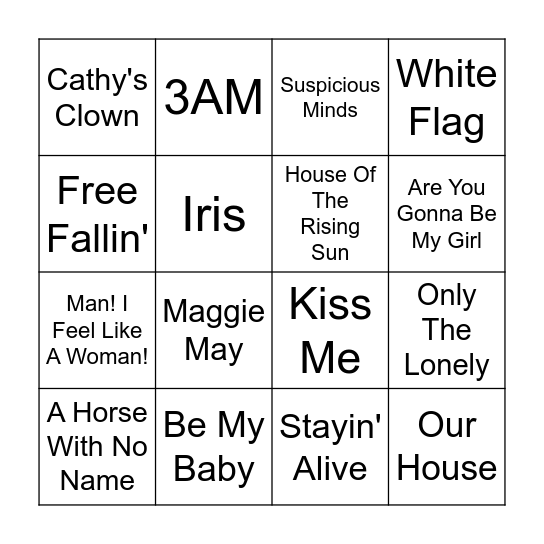 This bingo card has 30 words: Dream Lover, It's Now Or Never, Only The Lonely, The Great Pretender, Cathy's Clown, Suspicious Minds, House Of The Rising Sun, Paint It, Black, Be My Baby, Stand By Me, Stayin' Alive, A Horse With No Name, Piano Man, Go Your Own Way, Maggie May, Total Eclipse Of The Heart, I Love Rock 'N Roll, Our House, Don't You (Forget About Me), Free Fallin', Kiss Me, My Own Worst Enemy, 3AM, Man! I Feel Like A Woman!, Iris, White Flag, I Believe In A Thing Called Love, Beautiful Day, Are You Gonna Be My Girl and I Don't Feel Like Dancin'.