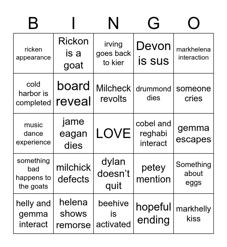 This bingo card has a free space and 29 words: helly and gemma interact, innie mark betrays outie mark, jame eagan dies, drowning scene, ricken appearance, irving goes back to kier, board reveal, milchick defects, cobel and reghabi interact, helena shows remorse, gemma escapes, markhelly kiss, beehive is activated, hopeful ending, someone cries, kier eagan is resurrected, dylan doesn’t quit, something bad happens to the goats, markhelena interaction, music dance experience, petey mention, hellyna pregnancy reveal, drummond dies, cold harbor is completed, Devon is sus, Rickon is a goat, Something about eggs, Milcheck revolts and Ms Huang returns.