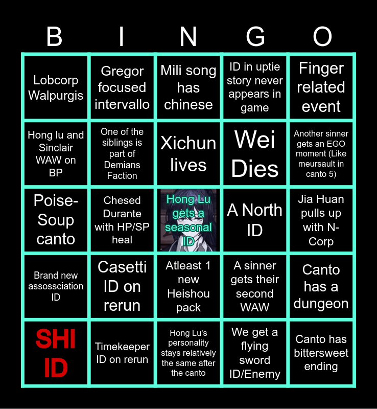This bingo card has a free space and 24 words: Casetti ID on rerun, Timekeeper ID on rerun, Xichun lives, SHI ID, Finger related event, Lobcorp Walpurgis, Hong lu and Sinclair WAW on BP, Gregor focused intervallo, A North ID, Atleast 1 new Heishou pack, Wei Dies, Poise-Soup canto, A sinner gets their second WAW, Canto has a dungeon, One of the siblings is part of Demians Faction, We get a flying sword ID/Enemy, Jia Huan pulls up with N-Corp, Mili song has chinese, Another sinner gets an EGO moment (Like meursault in canto 5), Chesed Durante with HP/SP heal, Canto has bittersweet ending, Brand new assossciation ID, ID in uptie story never appears in game and Hong Lu's personality stays relatively the same after the canto.
