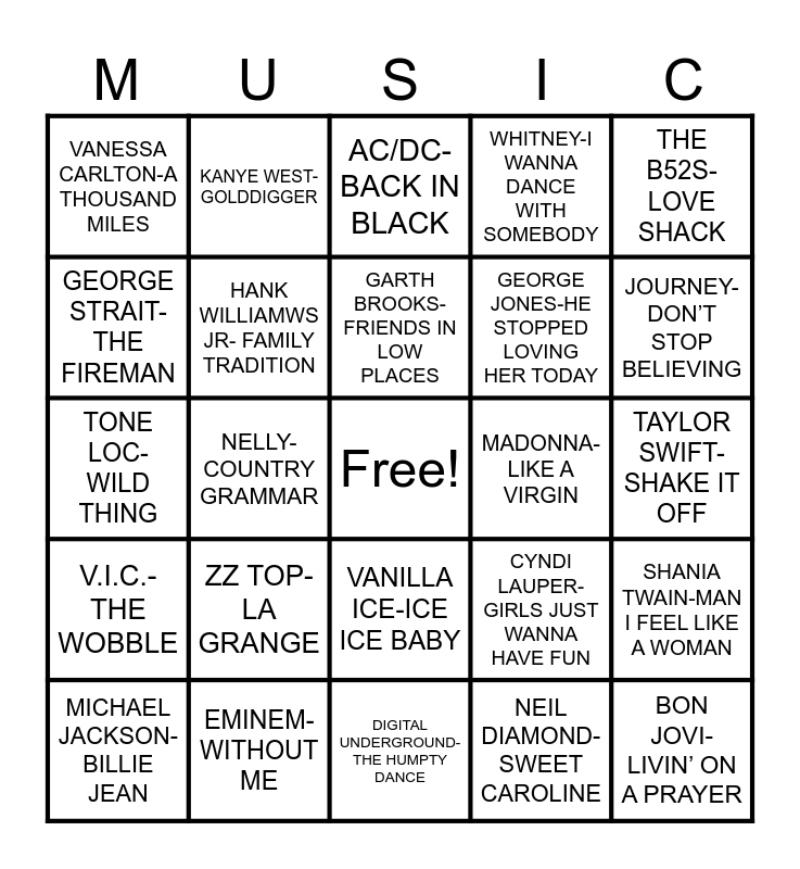 This bingo card has a free space and 45 words: QUEEN-WE WILL ROCK YOU, BON JOVI-LIVIN’ ON A PRAYER, EAGLES-HOTEL CALIFORNIA, MICHAEL JACKSON-BILLIE JEAN, VILLAGE PEOPLE-YMCA, NEIL DIAMOND-SWEET CAROLINE, AC/DC-BACK IN BLACK, GLORIA GAYNOR-I WILL SURVIVE, THE B52S-LOVE SHACK, EMINEM-WITHOUT ME, WHITNEY-I WANNA DANCE WITH SOMEBODY, MADONNA-LIKE A VIRGIN, VANILLA ICE-ICE ICE BABY, ZZ TOP-LA GRANGE, ELTON JOHN-BENNY AND THE JETS, DIGITAL UNDERGROUND-THE HUMPTY DANCE, SIR MIX A LOT-BABY GOT BACK, TONE LOC-WILD THING, MARK RONSON/BRUNO MARS-UPTOWN FUNK, JOURNEY-DON’T STOP BELIEVING, KANYE WEST-GOLDDIGGER, RICK ASTLEY-NEVER GONNA GIVE YOU UP, LINKIN PARK-IN THE END, VANESSA CARLTON-A THOUSAND MILES, WARREN G-REGULATE, TAYLOR SWIFT- SHAKE IT OFF, BONE THUGS N HARMONY-CROSSROADS, PROCLAIMERS-500 MILES, CYNDI LAUPER-GIRLS JUST WANNA HAVE FUN, V.I.C.- THE WOBBLE, SHAGGY-IT WASN’T ME, SHANIA TWAIN-MAN I FEEL LIKE A WOMAN, MILEY CYRUS-PARTY IN THE USA, BRYAN ADAMS-SUMMER OF 69, LYNYRD SKYNYRD-SWEET HOME ALABAMA, NELLY-COUNTRY GRAMMAR, SNOPP DOG-GIN AND JUICE, MC HAMMER-CANT TOUCH THIS, JOHN DENVER-THANK GOD IM A COUNTRY BOY, GARTH BROOKS-FRIENDS IN LOW PLACES, GEORGE STRAIT-THE FIREMAN, GEORGE JONES-HE STOPPED LOVING HER TODAY, CHARLIE DANIELS BAND-DEVIL WENT DOWN TO GEORGIA, HANK WILLIAMWS JR- FAMILY TRADITION and JOHNNY CASH-FOLSOM PRISON BLUES.