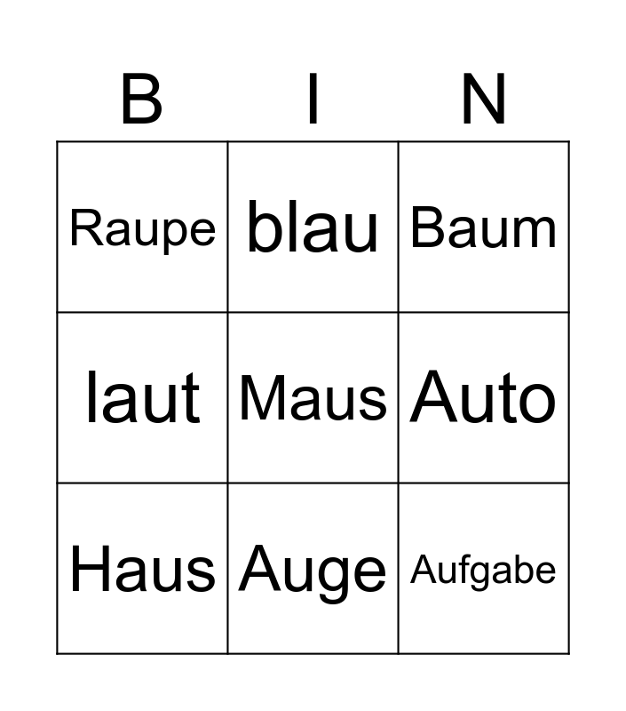 This bingo card has a free space and 8 words: Auto, Baum, blau, Haus, Raupe, Aufgabe, laut and Auge.