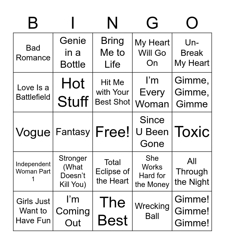 This bingo card has a free space and 73 words: Run the World (Girls), Vogue, Bad Romance, Time After Time, Just a Girl, Sweet Dreams, Independent Woman Part 1, Respect, She Works Hard for the Money, Like A Prayer, Believe, Physical, Hot Stuff, Toxic, Material girl, Genie in a Bottle, The Best, Love Is a Battlefield, Zombie Boy, Since U Been Gone, Hit Me with Your Best Shot, My Heart Will Go On, Un-Break My Heart, Man! I Feel Like a Woman, Girls Just Want to Have Fun, If You Had My Love, Dancing with Somebody, Lady Marmalade, Ain’t No Mountain High Enough, Killing Me Softly, I’m Coming Out, Sweet Child o’ Mine, Together Again, I Will Survive, Fantasy, My Hips Don’t Lie, It Feels So Good, Wind Beneath My Wings, Gimme! Gimme! Gimme!, Fighter, Wrecking Ball, Stronger (What Doesn’t Kill You), Say My Name, First Kiss, Girl on Fire, I’m Every Woman, Bring Me to Life, Just a Girl, Since U Been Gone, Vogue, Super Bass, The best, Nasty, Girls just want to have fun, Like a prayer, R-E-S-P-E-C-T, If I Ain’t Got You, Total Eclipse of the Heart, Piece of My Heart, Fight Song, What’s Love Got to Do with It, Say My Name, Girls Night Out, Gimme, Gimme, Gimme, Love on Top, Natural Woman, I’m Coming Out, Wind Beneath My Wings, All Through the Night, I Am Woman, Super Bass, Born This Way and Waiting for Tonight.