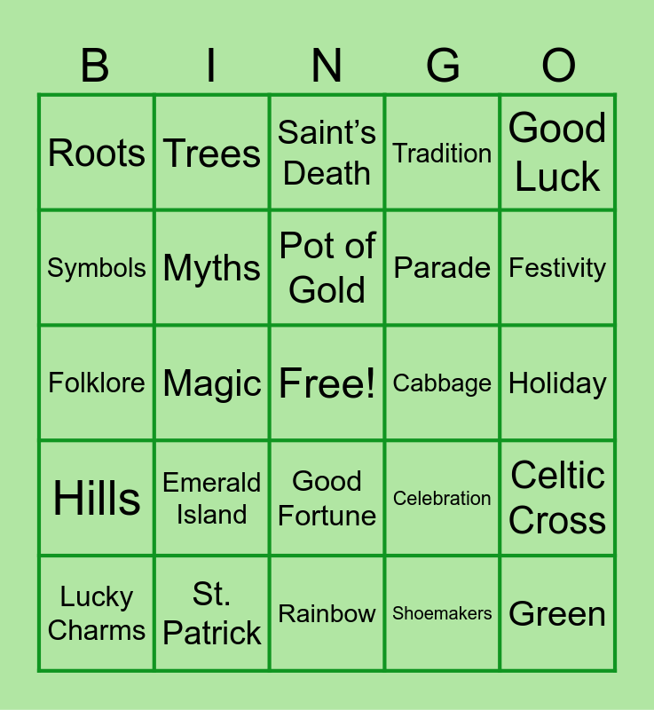 This bingo card has a free space and 56 words: Lucky Day, Lucky Charms, Horseshoe, Roots, Rainbow, Pinch, Myths, March 17, Parade, Marching Bands, Tradition, Irish Music, Festival, Chicago River, 4th century, Leprechaun, Good Luck, Magic, Culture, Green, Cabbage, St. Patrick’s Celebration, Celebration, Saint’s Death, History, Pot of Gold, Fairy, Saint, Festivity, Patron Saint, Corned Beef, Ireland, Irish Dance, Clover, Holiday, Symbols, Folklore, Christianity, Hills, Trees, Good Fortune, Snakes, Shamrock, Emerald, Luck, Emerald Island, St. Patrick, Four Leaf Clover, Green Beer, Guinness, Shoemakers, Irish Pub, Green Hat, Blarney Castle, Celtic Cross and Irish Flag.