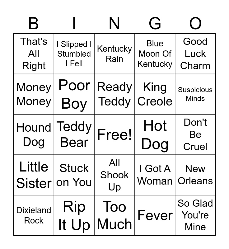 This bingo card has a free space and 29 words: Dixieland Rock, Love Me Tender, Teddy Bear, Return To Sender, That's All Right, Kentucky Rain, Poor Boy, Stuck on You, Hot Dog, Rip It Up, Don't Be Cruel, So Glad You're Mine, Too Much, Fever, Suspicious Minds, Jailhouse Rock, All Shook Up, Little Sister, Good Luck Charm, Hound Dog, I Got A Woman, Burning Love, King Creole, Money Money, Blue Moon Of Kentucky, I Slipped I Stumbled I Fell, New Orleans, Ready Teddy and Mean Woman Blues.