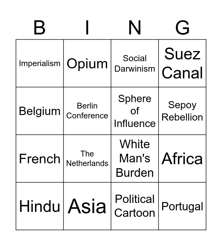 This bingo card has 16 words: Hindu, Asia, Social Darwinism, Suez Canal, Belgium, Opium, White Man's Burden, Africa, Imperialism, Berlin Conference, Political Cartoon, Sepoy Rebellion, French, The Netherlands, Sphere of Influence and Portugal.
