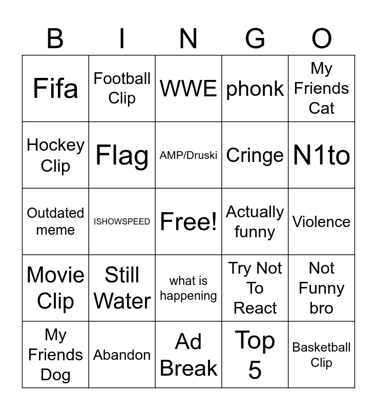 This bingo card has a free space and 24 words: Still Water, Abandon, AMP/Druski, My Friends Dog, My Friends Cat, Fifa, Hockey Clip, Football Clip, Actually funny, what is happening, Cringe, Outdated meme, Try Not To React, Not Funny bro, Flag, Top 5, Violence, WWE, N1to, ISHOWSPEED, Basketball Clip, Movie Clip, phonk and Ad Break.