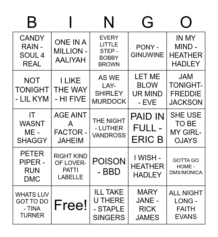 This bingo card has 28 words: GOTTA GO HOME - DMX/MONICA, STAND BY ME - BEN E. KING, LET ME BLOW UR MIND - EVE, MARY JANE - RICK JAMES, NOT TONIGHT - LIL KYM, EVERY LITTLE STEP - BOBBY BROWN, ONE IN A MILLION - AALIYAH, PETER PIPER - RUN DMC, PAID IN FULL - ERIC B, WHATS LUV GOT TO DO - TINA TURNER, IT WASNT ME - SHAGGY, PONY - GINUWINE, Free!, ILL TAKE U THERE - STAPLE SINGERS, JAM TONIGHT- FREDDIE JACKSON, BABY - TLC, RIGHT KIND OF LOVER- PATTI LABELLE, I LIKE THE WAY - HI FIVE, AS WE LAY- SHIRLEY MURDOCK, POISON - BBD, CANDY RAIN - SOUL 4 REAL, ALL NIGHT LONG - FAITH EVANS, THE NIGHT - LUTHER VANDROSS, AGE AINT A FACTOR - JAHEIM, SHE USE TO BE MY GIRL- OJAYS, I WISH - HEATHER HADLEY, IN MY MIND - HEATHER HADLEY and CURSED - VIVIAN GREEN.