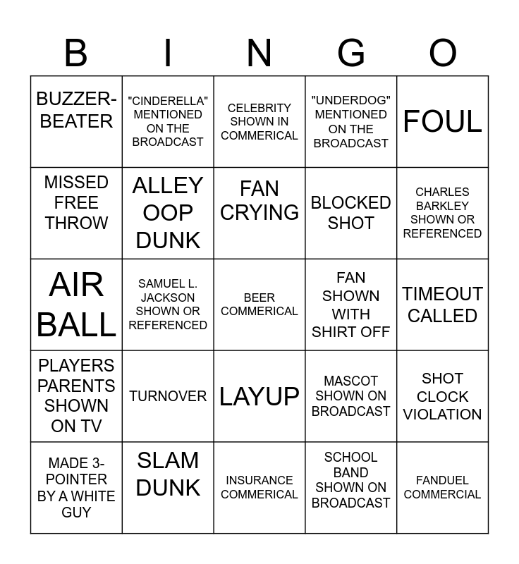 This bingo card has a free space and 24 words: TURNOVER, SLAM DUNK, FAN CRYING, MADE 3-POINTER BY A WHITE GUY, FOUL, BUZZER-BEATER, MISSED FREE THROW, "CINDERELLA" MENTIONED ON THE BROADCAST, FAN SHOWN WITH SHIRT OFF, LAYUP, BLOCKED SHOT, AIR BALL, MASCOT SHOWN ON BROADCAST, SHOT CLOCK VIOLATION, ALLEY OOP DUNK, SCHOOL BAND SHOWN ON BROADCAST, TIMEOUT CALLED, CELEBRITY SHOWN IN COMMERICAL, CHARLES BARKLEY SHOWN OR REFERENCED, SAMUEL L. JACKSON SHOWN OR REFERENCED, FANDUEL COMMERCIAL, PLAYERS PARENTS SHOWN ON TV, "UNDERDOG" MENTIONED ON THE BROADCAST and INSURANCE COMMERICAL.