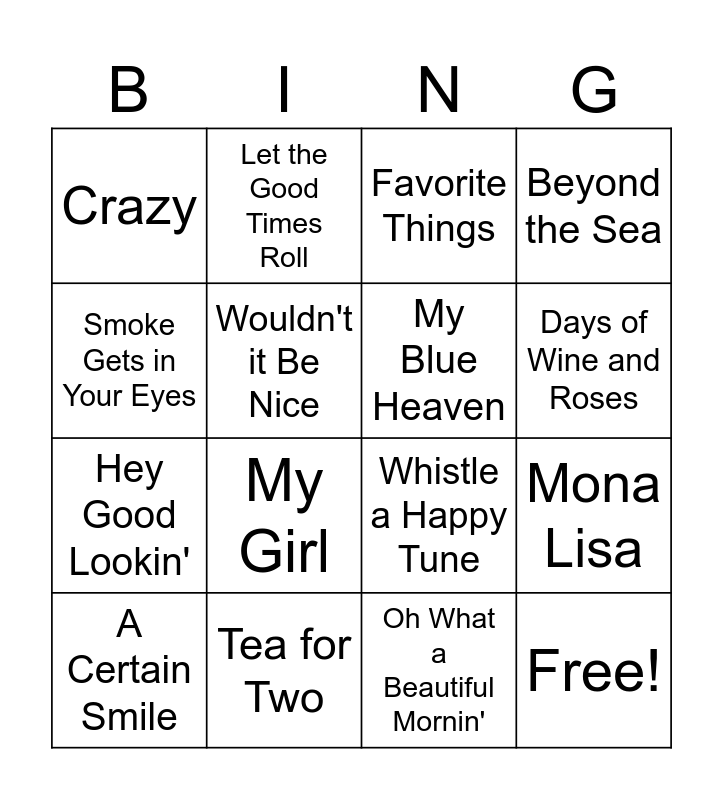 This bingo card has 23 words: Free!, Let Me Call You Sweetheart, Days of Wine and Roses, Earth Angel, Smoke Gets in Your Eyes, Crazy, Wouldn't it Be Nice, Let the Good Times Roll, A Certain Smile, By the Light of the Silvery Moon, My Girl, Hey Good Lookin', Ring of Fire, Ain't She Sweet, Tea for Two, Hound Dog, Favorite Things, Whistle a Happy Tune, My Blue Heaven, Mona Lisa, Beyond the Sea, Oh What a Beautiful Mornin' and Some Enchanted Evening.