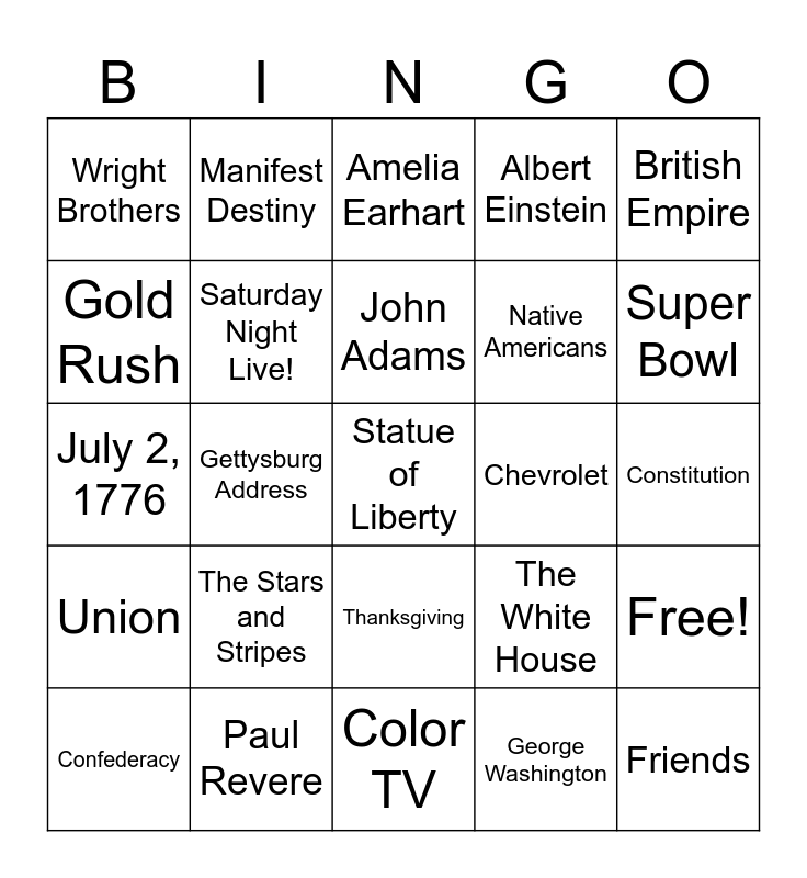 This bingo card has 26 words: Thanksgiving, George Washington, John Adams, Paul Revere, British Empire, Wright Brothers, Gold Rush, Manifest Destiny, Constitution, The White House, Native Americans, July 2, 1776, Free!, Confederacy, Gettysburg Address, Dwight D. Eisenhower, Albert Einstein, Union, Amelia Earhart, Statue of Liberty, Super Bowl, Color TV, Chevrolet, The Stars and Stripes, Saturday Night Live! and Friends.