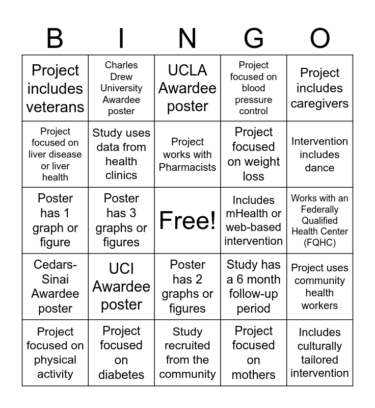 This bingo card has a free space and 24 words: UCI Awardee poster, Project focused on diabetes, Project works with Pharmacists, Project focused on physical activity, Project includes caregivers, Project includes veterans, Project focused on liver disease or liver health, Charles Drew University Awardee poster, Includes mHealth or web-based intervention, Poster has 2 graphs or figures, Project focused on weight loss, Poster has 1 graph or figure, Study has a 6 month follow-up period, Project uses community health workers, Study uses data from health clinics, Project focused on mothers, Works with an Federally Qualified Health Center (FQHC), UCLA Awardee poster, Intervention includes dance, Poster has 3 graphs or figures, Includes culturally tailored intervention, Cedars-Sinai Awardee poster, Project focused on blood pressure control and Study recruited from the community.