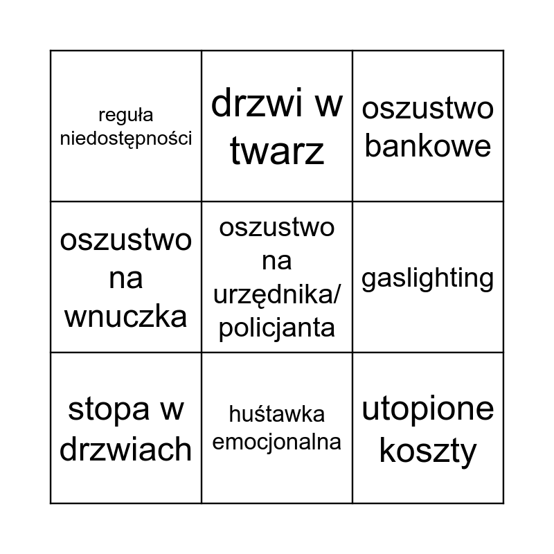 This bingo card has 14 words: Bombardowanie miłością, Reguła wzajemności, stopa w drzwiach, drzwi w twarz, oszustwo na wnuczka, oszustwo na urzędnika/ policjanta, utopione koszty, poczucie winy (szantaż emocjonalny), huśtawka emocjonalna, reguła niedostępności, autorytet, gaslighting, oszustwo bankowe and oszustwo w sklepie internetowym.
