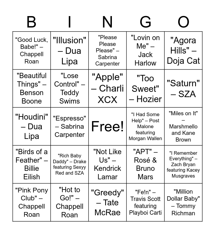 This bingo card has a free space and 30 words: "Hot to Go!" – Chappell Roan, “Cheerleader” – Porter Robinson, "Espresso" – Sabrina Carpenter, "A Bar Song (Tipsy)" – Shaboozey, "Good Luck, Babe!" – Chappell Roan, "Please Please Please" – Sabrina Carpenter, "Lose Control" – Teddy Swims, "Not Like Us" – Kendrick Lamar, "I Had Some Help" – Post Malone featuring Morgan Wallen, "Greedy" – Tate McRae, "Miles on It" – Marshmello and Kane Brown, "Million Dollar Baby" – Tommy Richman, "Fe!n" – Travis Scott featuring Playboi Carti, "I Can Do It with a Broken Heart" – Taylor Swift, "Saturn" – SZA, "Fortnight" – Taylor Swift featuring Post Malone, "APT" – Rosé & Bruno Mars, "Birds of a Feather" – Billie Eilish, "Rich Baby Daddy" – Drake featuring Sexyy Red and SZA, "Agora Hills" – Doja Cat, "Houdini" – Dua Lipa, "Double Life" – Pharrell Williams, "Illusion" – Dua Lipa, "Too Sweet" – Hozier, "Beautiful Things" – Benson Boone, "Lovin on Me" – Jack Harlow, "I Remember Everything" – Zach Bryan featuring Kacey Musgraves, "Pink Pony Club" – Chappell Roan, "Apple" – Charli XCX and "Fast Car" – Luke Comb.