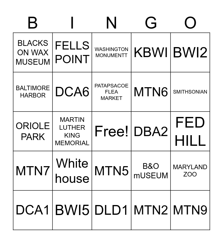 This bingo card has a free space and 24 words: White house, BWI5, PATAPSACOE FLEA MARKET, DCA1, BWI2, BLACKS ON WAX MUSEUM, BALTIMORE HARBOR, FELLS POINT, DBA2, MTN5, MTN6, ORIOLE PARK, B&O mUSEUM, MARYLAND ZOO, DCA6, MTN2, FED HILL, WASHINGTON MONUMENTT, SMITHSONIAN, MARTIN LUTHER KING MEMORIAL, MTN9, MTN7, KBWI and DLD1.