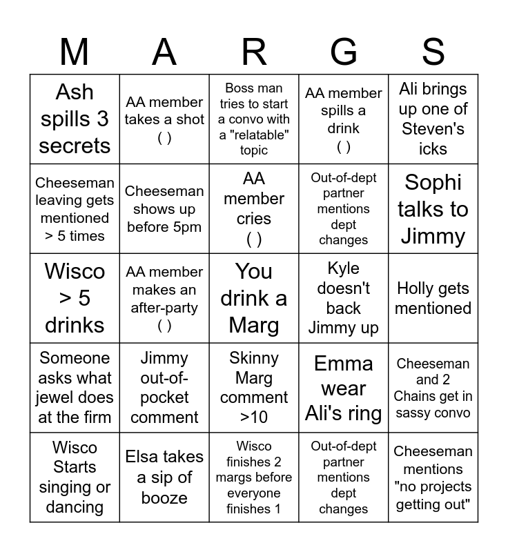 This bingo card has a free space and 24 words: Jimmy out-of-pocket comment, Elsa takes a sip of booze, AA member cries ( ), Wisco Starts singing or dancing, Ali brings up one of Steven's icks, Ash spills 3 secrets, Cheeseman leaving gets mentioned > 5 times, AA member takes a shot ( ), Kyle doesn't back Jimmy up, Skinny Marg comment >10, Out-of-dept partner mentions dept changes, Wisco > 5 drinks, Emma wear Ali's ring, Cheeseman and 2 Chains get in sassy convo, Cheeseman shows up before 5pm, Out-of-dept partner mentions dept changes, Holly gets mentioned, Boss man tries to start a convo with a "relatable" topic, Sophi talks to Jimmy, AA member makes an after-party ( ), Cheeseman mentions "no projects getting out", Someone asks what jewel does at the firm, AA member spills a drink ( ) and Wisco finishes 2 margs before everyone finishes 1.