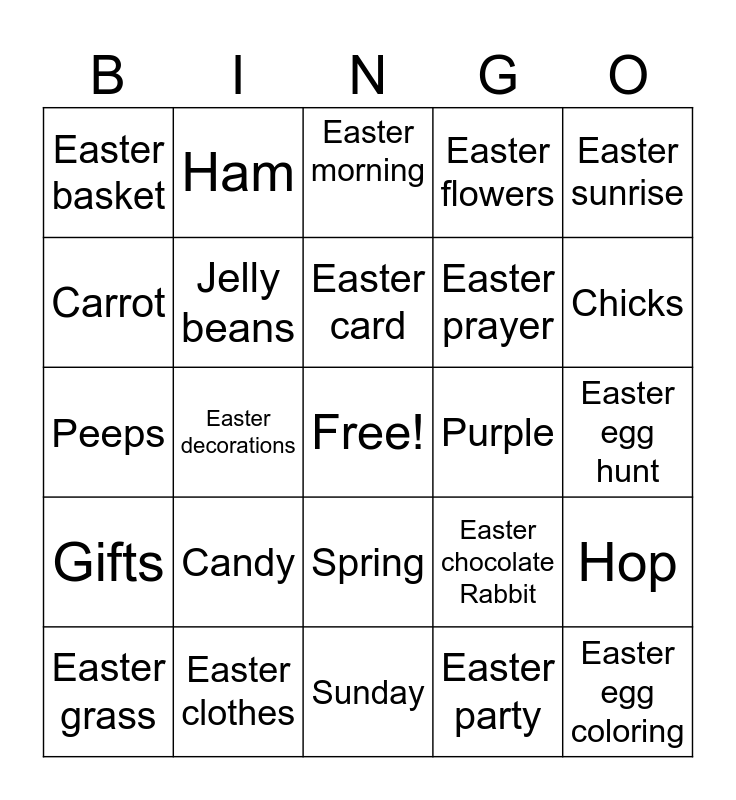 This bingo card has a free space and 29 words: Easter bunny, Easter clothes, Easter morning, Palms, Easter sunrise, Easter basket, Jelly beans, Easter card, Purple, Hop, Easter grass, Easter decorations, Easter party, Easter egg coloring, Peeps, Easter church service, Sunday, Easter chocolate Rabbit, Chicks, Gifts, Candy, Good Friday, Easter prayer, Easter egg hunt, Carrot, Ham, Spring, Easter flowers and Ash Wednesday.