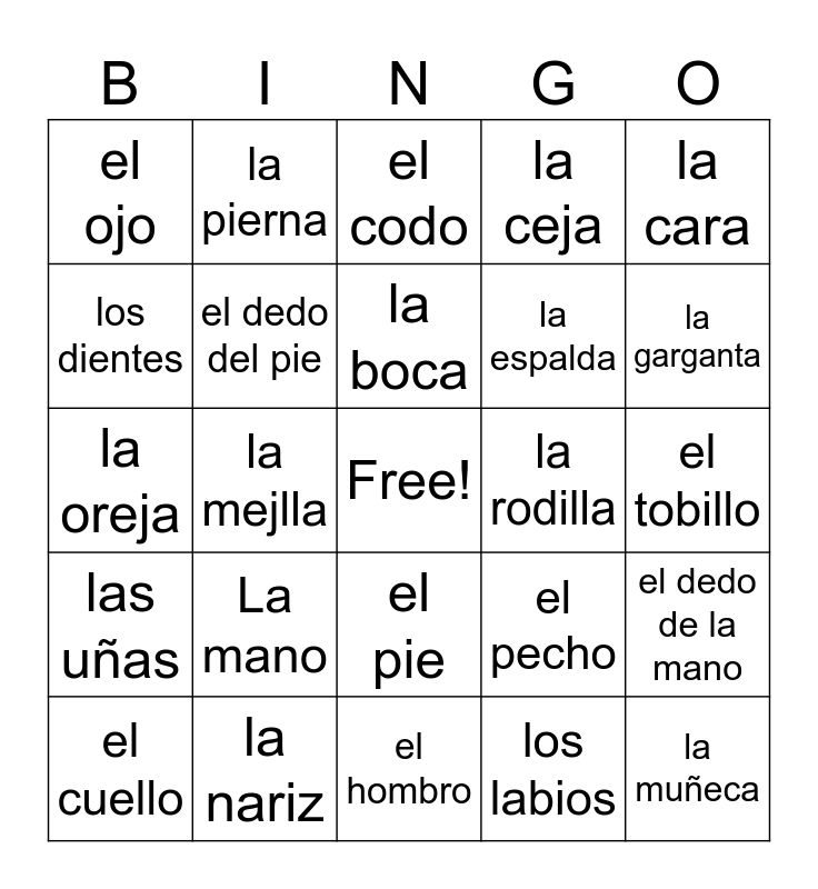 This bingo card has a free space and 24 words: La mano, la nariz, la boca, el cuello, la cara, el ojo, los dientes, la pierna, la rodilla, el pie, la espalda, la oreja, el pecho, el dedo de la mano, el dedo del pie, los labios, el tobillo, el codo, la garganta, la mejlla, la muñeca, las uñas, la ceja and el hombro.