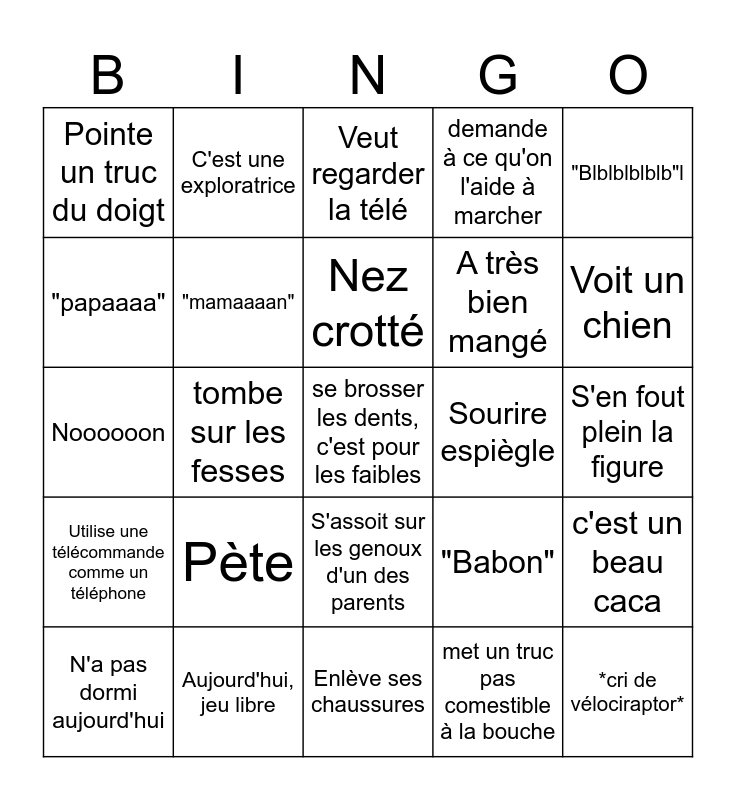 This bingo card has a free space and 24 words: N'a pas dormi aujourd'hui, Pète, Nez crotté, met un truc pas comestible à la bouche, "Blblblblblb"l, Pointe un truc du doigt, C'est une exploratrice, Veut regarder la télé, Sourire espiègle, S'en fout plein la figure, Noooooon, "mamaaaan", "Babon", c'est un beau caca, "papaaaa", Aujourd'hui, jeu libre, Enlève ses chaussures, demande à ce qu'on l'aide à marcher, Voit un chien, Utilise une télécommande comme un téléphone, tombe sur les fesses, S'assoit sur les genoux d'un des parents, A très bien mangé and *cri de vélociraptor*.