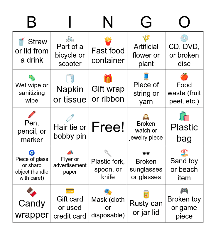 This bingo card has a free space and 29 words: ๐ซ Candy wrapper, ๐ฅค Plastic bottle, ๐งท Hair tie or bobby pin, ๐ Fabric scrap or torn clothing, ๐ฅค Straw or lid from a drink, ๐ Fast food container, ๐งป Napkin or tissue, ๐ฃ Flyer or advertisement paper, ๐ฐ๏ธ Broken watch or jewelry piece, ๐ณ Gift card or used credit card, ๐๏ธ Plastic bag, ๐ฎ Broken toy or game piece, ๐ญ Mask (cloth or disposable), ๐ฅซ Rusty can or jar lid, ๐ Food waste (fruit peel, etc.), ๐ Paper or receipt, ๐ฅ Plastic fork, spoon, or knife, ๐งฟ Piece of glass or sharp object (handle with care!), ๐ฟ CD, DVD, or broken disc, ๐๏ธ Pen, pencil, or marker, ๐ถ๏ธ Broken sunglasses or glasses, ๐งผ Soap or sanitizer bottle, ๐งต Piece of string or yarn, ๐ฆ Wet wipe or sanitizing wipe, ๐พ Artificial flower or plant, ๐ฒ Part of a bicycle or scooter, ๐๏ธ Sand toy or beach item, ๐ Gift wrap or ribbon and ๐ Piece of wire or cable.