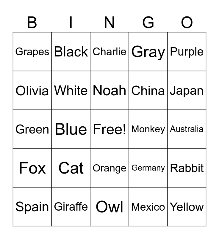 This bingo card has a free space and 75 words: Alice, Bob, Charlie, David, Eve, Frank, Grace, Henry, Isabella, Jack, Kate, Liam, Noah, Olivia, Red, Blue, Mia, Yellow, Orange, Purple, Pink, Green, White, Black, Gray, Teal, Brown, Violet, Gold, UK, Canada, Magenta, France, Germany, Japan, China, US, Brazil, Australia, Mexico, Italy, India, Russia, Philippines, Apple, Banana, Spain, Grapes, Strawberry, Blueberry, Watermelon, Orange, Pineapple, Peach, Pear, Cherry, Mango, Raspberry, Lemon, Dog, Cat, Kiwi, Lion, Tiger, Bear, Monkey, Elephant, Zebra, Horse, Rabbit, Fox, Giraffe, Deer, Owl and Wolf.