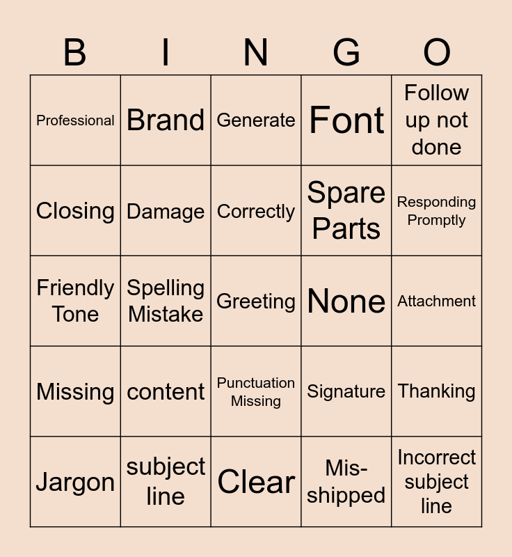 This bingo card has 30 words: subject line, Packaging, Spelling Mistake, Signature, Professional, Generate, Damage, Punctuation Missing, None, Clear, Attachment, Greeting, Mis-shipped, Incorrect subject line, Responding Promptly, Grammer, Signature, Missing, content, Follow up not done, Friendly Tone, Missed to use Macro, Brand, Spare Parts, Closing, Font, Thanking, Jargon, Correctly and Avoiding All Caps.