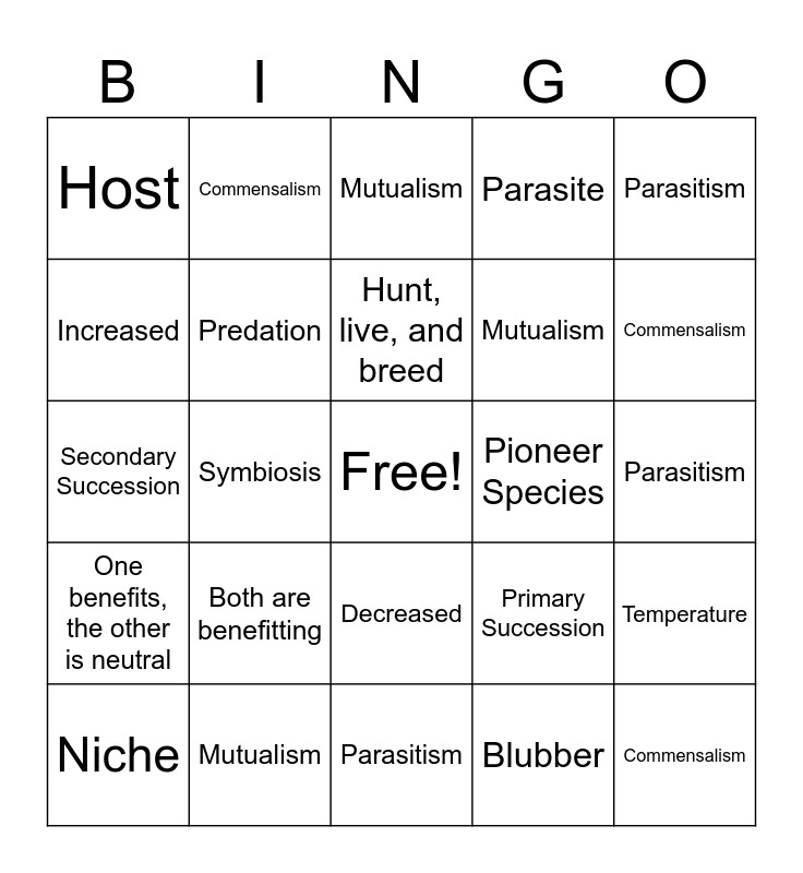 This bingo card has a free space and 25 words: Both are benefitting, Parasitism, Hunt, live, and breed, Niche, Parasitism, Host, Increased, Commensalism, Pioneer Species, Decreased, Mutualism, Secondary Succession, Primary Succession, Temperature, Predation, Sea Ice, Parasitism, Mutualism, Commensalism, Symbiosis, Commensalism, Mutualism, One benefits, the other is neutral, Parasite and Blubber.