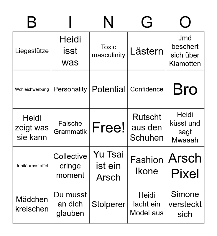 This bingo card has a free space and 36 words: Heidi redet über Male Body, Heidi redet im Plusquamperfekt, Diversity, Personality, Fashion Ikone, Jubiläumsstaffel, Potential, Ist immer noch ein Wettbewerb, Jmd beschert sich über Klamotten, Weirde Anglizismen, Falsche Grammatik, Lästern, Im Gesicht fehlt was, Rutscht aus den Schuhen, Bro, Liegestütze, Oberkörperfrei, Collective cringe moment, Simone versteckt sich, Toxic masculinity, Heidi küsst und sagt Mwaaah, Arsch Pixel, Du musst an dich glauben, Mädchen kreischen, Stolperer, Heidi isst was, Heidi zeigt was sie kann, Shooting geht mal wieder mega schnell, Confidence, Wchleichwerbung, Will noch nicht rausfliegen, Model aus vorherigen Staffeln zu sehen, Heidi lacht ein Model aus, Yu Tsai ist ein Arsch, Langweilig and Einer heult.