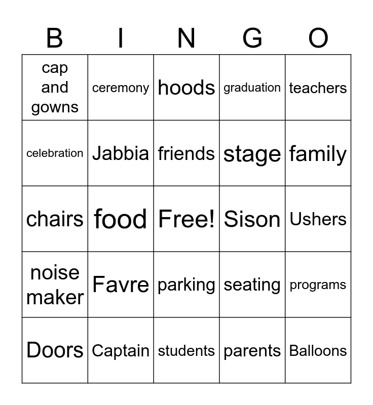 This bingo card has a free space and 29 words: Doors, Lineup, food, on time, cap and gowns, hoods, Jabbia, Favre, Sison, Captain, Ushers, Balloons, students, parents, family, university, parking, noise maker, teachers, chairs, seating, listen, stage, celebration, graduation, ceremony, programs, friends and flowers.