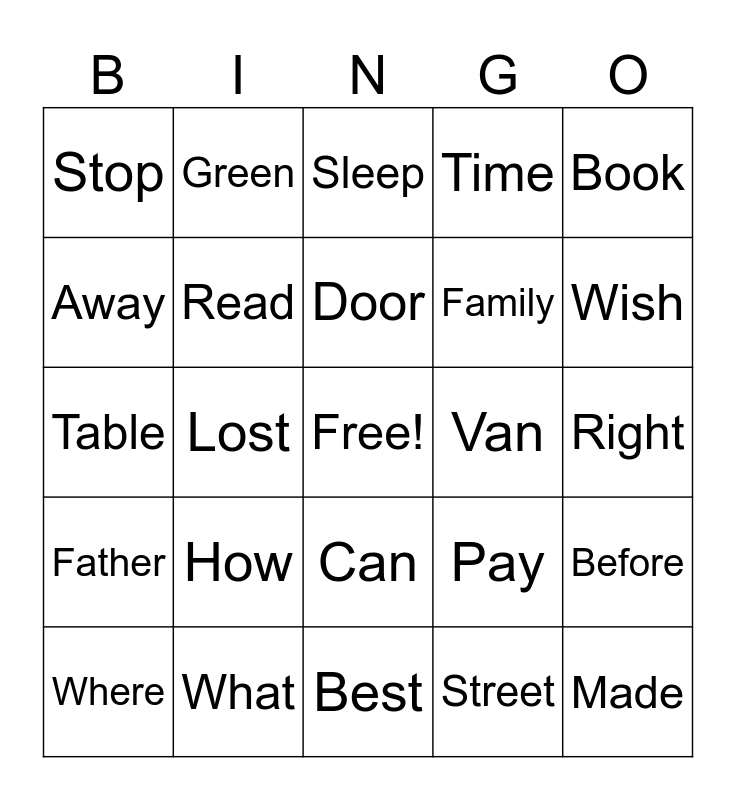 This bingo card has a free space and 24 words: How, What, Door, Where, Book, Stop, Away, Green, Van, Can, Family, Table, Pay, Before, Read, Street, Right, Sleep, Wish, Lost, Made, Father, Time and Best.