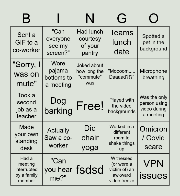This bingo card has a free space and 24 words: Actually Saw a co-worker, "Can you hear me?", Joked about how long the "commute" was, Had a meeting interrupted by a family member, Spotted a pet in the background, Sent a GIF to a co-worker, "Sorry, I was on mute", "Can everyone see my screen?", Played with the video backgrounds, Did chair yoga, "Moooom..... Daaaad?!?", Took a second job as a teacher, Worked in a different room to shake things up, Omicron / Covid scare, Wore pajama bottoms to a meeting, Witnessed (or were a victim of) an awkward video freeze, Was the only person using video during a meeting, Had lunch courtesy of your pantry, Microphone breathing, Dog barking, VPN issues, Made your own standing desk, Teams lunch date and fsdsd.