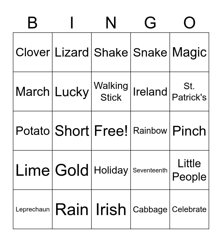 This bingo card has a free space and 29 words: Leprechaun, Green, Short, Shamrock, Clover, Shake, Lucky, Gold, Rainbow, Rain, Pinch, Celebrate, Irish, Cabbage, St. Patrick's, Coins, Holiday, Lime, Magic, Potato, Seventeenth, Tradition, Ireland, March, Snake, Lizard, Little People, Walking Stick and Garlic.