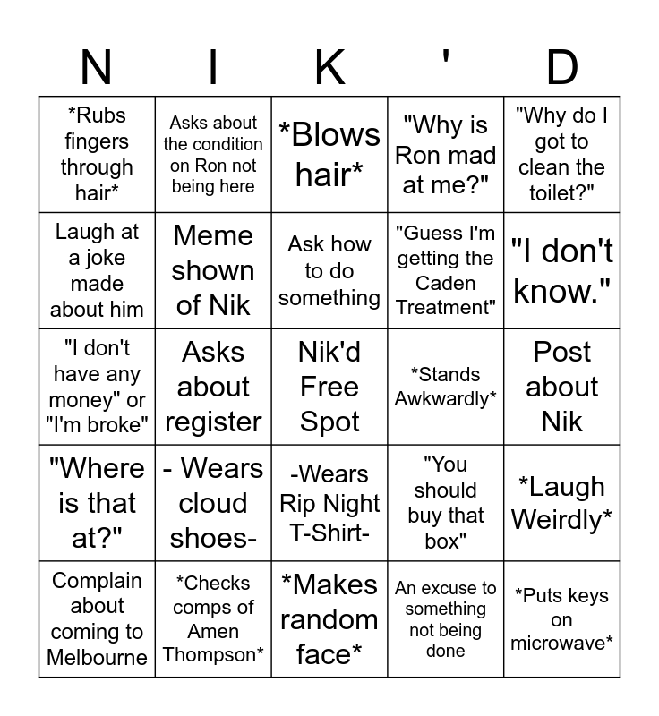 This bingo card has a free space and 24 words: - Wears cloud shoes-, *Checks comps of Amen Thompson*, Ask how to do something, Complain about coming to Melbourne, "Why do I got to clean the toilet?", *Rubs fingers through hair*, Laugh at a joke made about him, Asks about the condition on Ron not being here, *Stands Awkwardly*, -Wears Rip Night T-Shirt-, "Guess I'm getting the Caden Treatment", "I don't have any money" or "I'm broke", "You should buy that box", *Laugh Weirdly*, Meme shown of Nik, An excuse to something not being done, Post about Nik, *Blows hair*, "I don't know.", Asks about register, *Puts keys on microwave*, "Where is that at?", "Why is Ron mad at me?" and *Makes random face*.