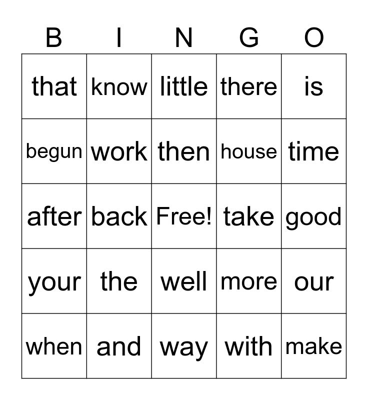 This bingo card has a free space and 24 words: the, and, then, when, is, that, begun, know, take, well, house, after, more, our, work, with, good, little, time, back, make, your, there and way.