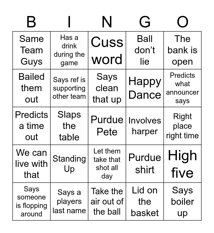 This bingo card has a free space and 24 words: Standing Up, Says a players last name, Says clean that up, Says someone is flopping around, The bank is open, Same Team Guys, Bailed them out, Has a drink during the game, Involves harper, Let them take that shot all day, Happy Dance, Predicts a time out, Purdue shirt, High five, Says ref is supporting other team, Lid on the basket, Right place right time, Cuss word, Predicts what announcer says, Slaps the table, Says boiler up, We can live with that, Ball don’t lie and Take the air out of the ball.