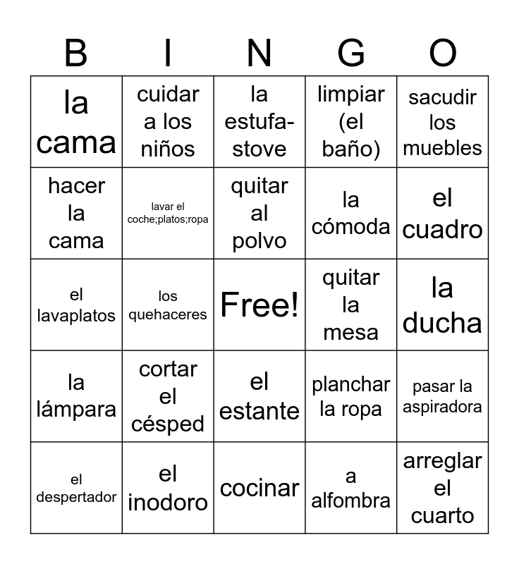 This bingo card has a free space and 46 words: ayudar, arreglar el cuarto, barrer el piso, cocinar, cortar el césped, caminar al perro, cuidar a los niños, darle de comer al perro/gato, hacer la cama, ir de compras, lavar el coche;platos;ropa, limpiar (el baño), pasar la aspiradora, planchar la ropa, poner la mesa, Preparar la comida, quitar al polvo, quitar la mesa, sacar la basura, sacudir los muebles, los quehaceres, a alfombra, la cama, la cómoda, las cortinas, el cuadro, el despertador, el espejo, el estante, la lámpara, la pared, el escritorio, La computadora, la bañera, el lavabo, el inodoro, la ducha, el grifo, a mesa, las sillas, el refrigerador, la estufa-stove, el lavaplatos, el microondas, el televisor and el sofá.