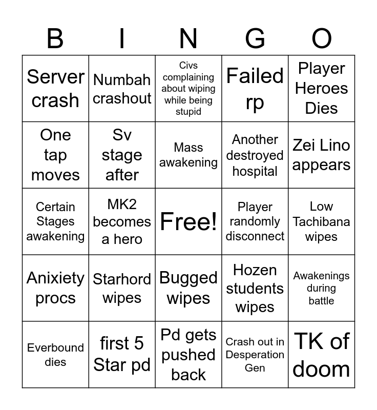 This bingo card has a free space and 24 words: Starhord wipes, first 5 Star pd, Mass awakening, Everbound dies, Player Heroes Dies, Server crash, One tap moves, Numbah crashout, Player randomly disconnect, Bugged wipes, Another destroyed hospital, Certain Stages awakening, Hozen students wipes, Awakenings during battle, Sv stage after, Crash out in Desperation Gen, Low Tachibana wipes, Civs complaining about wiping while being stupid, Zei Lino appears, MK2 becomes a hero, TK of doom, Anixiety procs, Failed rp and Pd gets pushed back.