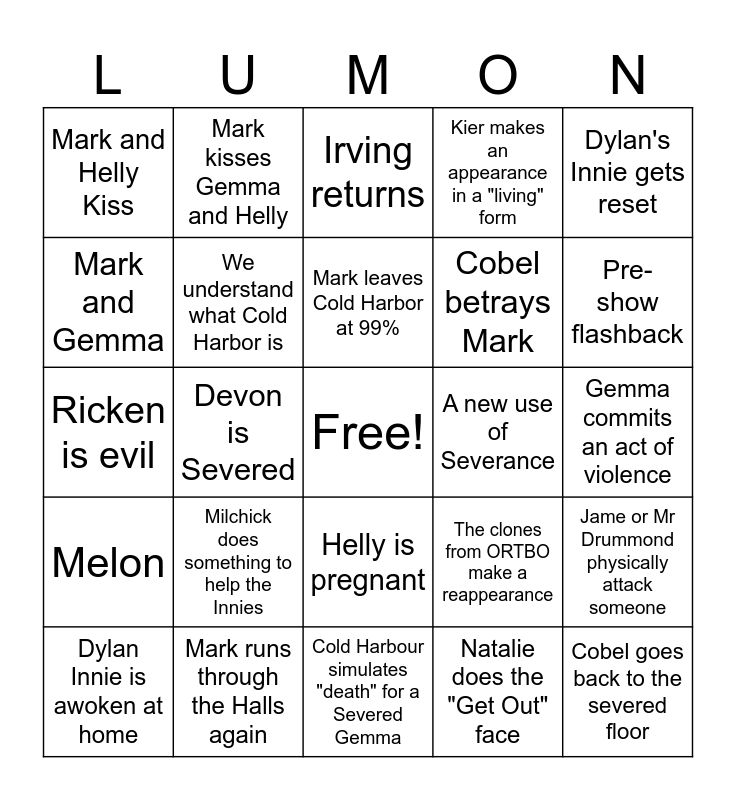This bingo card has a free space and 24 words: Milchick does something to help the Innies, Mark runs through the Halls again, Mark leaves Cold Harbor at 99%, Dylan Innie is awoken at home, Dylan's Innie gets reset, Mark and Helly Kiss, Mark and Gemma, Mark kisses Gemma and Helly, A new use of Severance, Helly is pregnant, Cobel betrays Mark, Ricken is evil, The clones from ORTBO make a reappearance, Jame or Mr Drummond physically attack someone, We understand what Cold Harbor is, Natalie does the "Get Out" face, Gemma commits an act of violence, Irving returns, Pre-show flashback, Devon is Severed, Cobel goes back to the severed floor, Melon, Kier makes an appearance in a "living" form and Cold Harbour simulates "death" for a Severed Gemma.