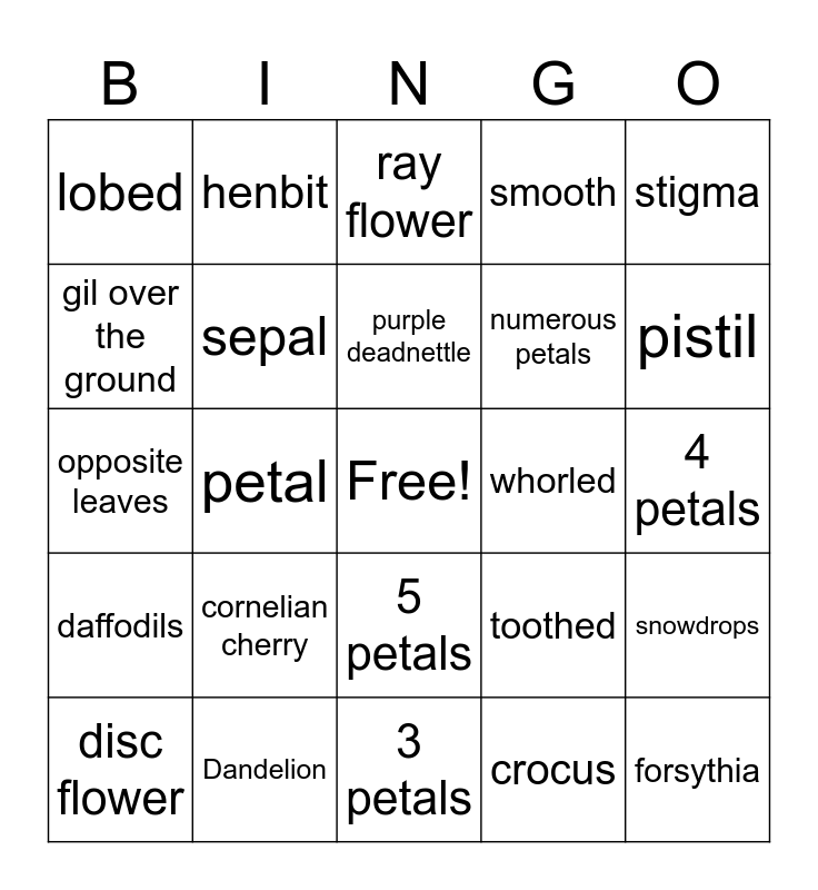 This bingo card has a free space and 29 words: disc flower, stem, petal, alternate leaves, lobed, ray flower, sepal, cornelian cherry, whorled, Dandelion, 4 petals, forsythia, 3 petals, crocus, pistil, compound umbel, 5 petals, daffodils, stigma, opposite leaves, toothed, irregular, numerous petals, gil over the ground, smooth, henbit, snowdrops, purple deadnettle and stamen.