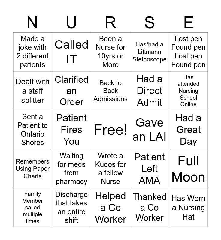 This bingo card has a free space and 24 words: Waiting for meds from pharmacy, Discharge that takes an entire shift, Back to Back Admissions, Family Member called multiple times, Lost pen Found pen Lost pen Found pen, Made a joke with 2 different patients, Dealt with a staff splitter, Called IT, Gave an LAI, Wrote a Kudos for a fellow Nurse, Had a Direct Admit, Sent a Patient to Ontario Shores, Patient Left AMA, Full Moon, Clarified an Order, Thanked a Co Worker, Had a Great Day, Been a Nurse for 10yrs or More, Has attended Nursing School Online, Patient Fires You, Has Worn a Nursing Hat, Remembers Using Paper Charts, Has/had a Littmann Stethoscope and Helped a Co Worker.