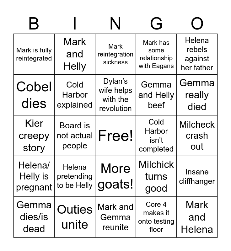 This bingo card has a free space and 24 words: Helena pretending to be Helly, Outies unite, Dylan’s wife helps with the revolution, Gemma dies/is dead, Helena rebels against her father, Mark is fully reintegrated, Cobel dies, Mark and Helly, Cold Harbor isn’t completed, More goats!, Gemma and Helly beef, Kier creepy story, Milchick turns good, Insane cliffhanger, Cold Harbor explained, Core 4 makes it onto testing floor, Milcheck crash out, Mark reintegration sickness, Gemma really died, Board is not actual people, Mark and Helena, Helena/ Helly is pregnant, Mark has some relationship with Eagans and Mark and Gemma reunite.