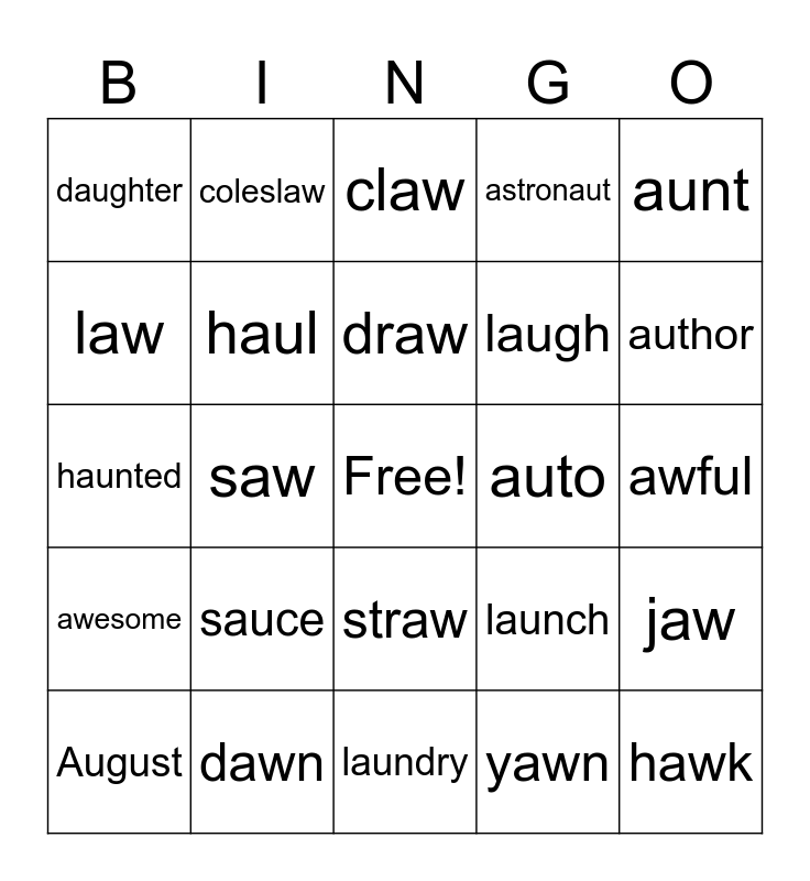 This bingo card has a free space and 29 words: August, lawn, saw, raw, daughter, claw, haul, sauce, auto, dawn, awful, hawk, laundry, yawn, author, fault, straw, awesome, aunt, haunted, launch, scrawny, laugh, law, astronaut, coleslaw, jaw, draw and crawl.
