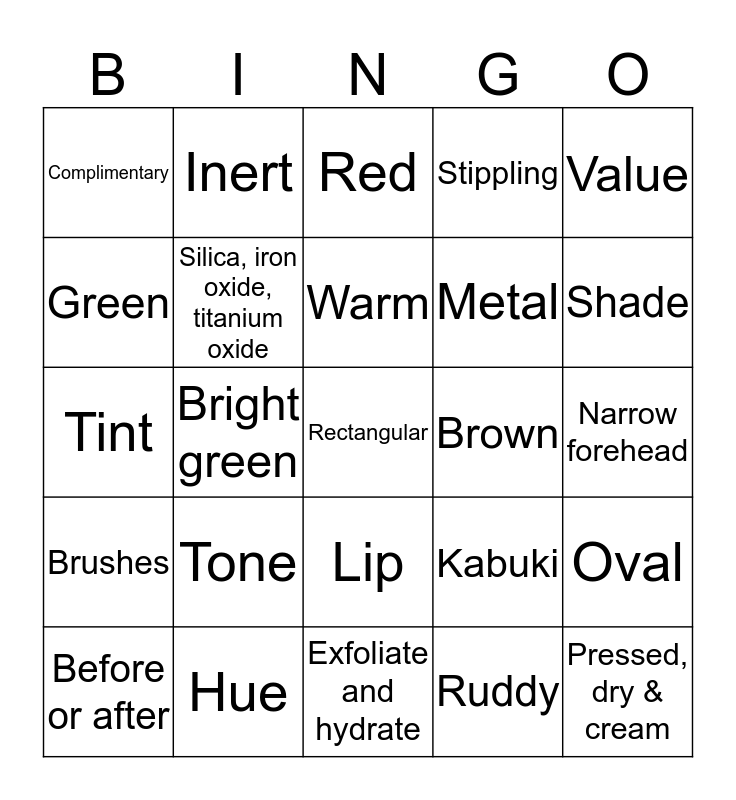 This bingo card has 25 words: Tone, Exfoliate and hydrate, Warm, Before or after, Value, Complimentary, Green, Inert, Brown, Lip, Metal, Tint, Kabuki, Oval, Silica, iron oxide, titanium oxide, Pressed, dry & cream, Narrow forehead, Red, Shade, Bright green, Rectangular, Hue, Brushes, Stippling and Ruddy.