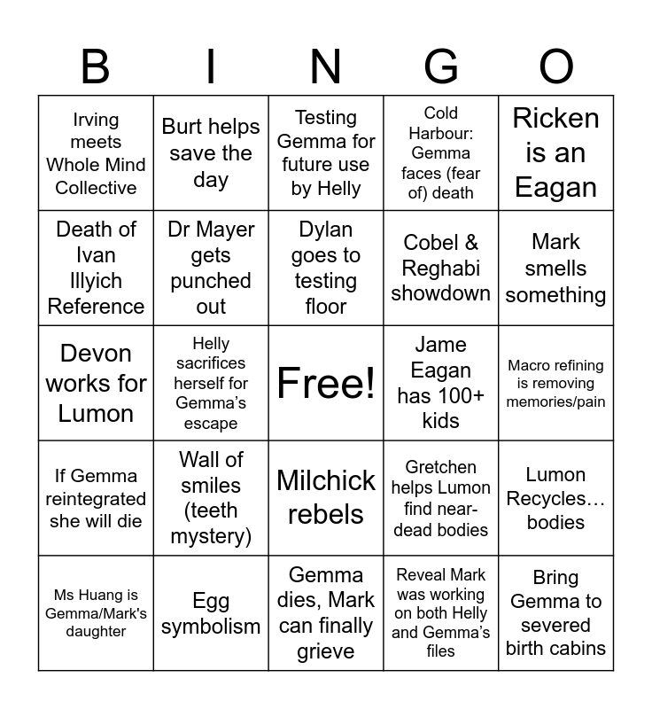 This bingo card has a free space and 24 words: Wall of smiles (teeth mystery), Egg symbolism, Dylan goes to testing floor, Ms Huang is Gemma/Mark's daughter, Ricken is an Eagan, Irving meets Whole Mind Collective, Death of Ivan Illyich Reference, Burt helps save the day, Jame Eagan has 100+ kids, Milchick rebels, Cobel & Reghabi showdown, Devon works for Lumon, Gretchen helps Lumon find near-dead bodies, Lumon Recycles… bodies, Dr Mayer gets punched out, Reveal Mark was working on both Helly and Gemma’s files, Macro refining is removing memories/pain, Testing Gemma for future use by Helly, Mark smells something, Helly sacrifices herself for Gemma’s escape, Bring Gemma to severed birth cabins, If Gemma reintegrated she will die, Cold Harbour: Gemma faces (fear of) death and Gemma dies, Mark can finally grieve.
