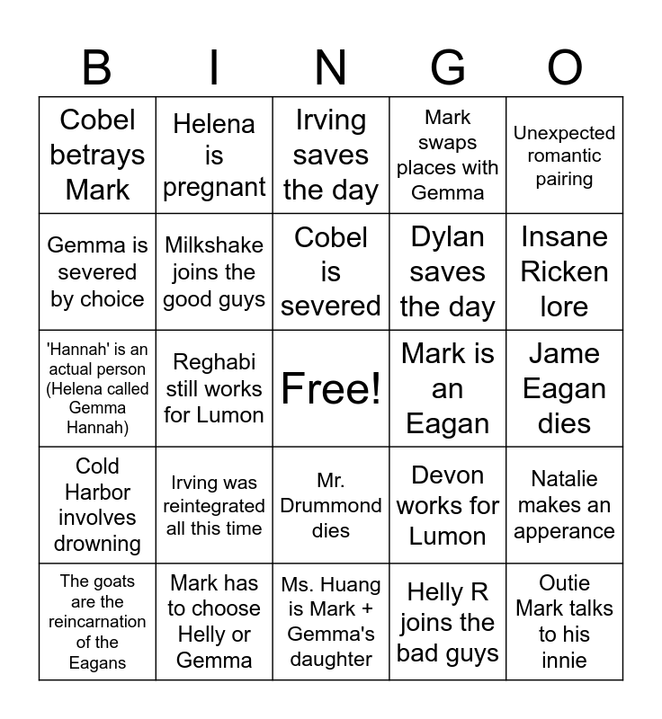 This bingo card has a free space and 24 words: Irving was reintegrated all this time, Mark has to choose Helly or Gemma, Cobel is severed, The goats are the reincarnation of the Eagans, Unexpected romantic pairing, Cobel betrays Mark, Gemma is severed by choice, Helena is pregnant, Mark is an Eagan, Mr. Drummond dies, Dylan saves the day, 'Hannah' is an actual person (Helena called Gemma Hannah), Devon works for Lumon, Natalie makes an apperance, Milkshake joins the good guys, Helly R joins the bad guys, Jame Eagan dies, Irving saves the day, Insane Ricken lore, Reghabi still works for Lumon, Outie Mark talks to his innie, Cold Harbor involves drowning, Mark swaps places with Gemma and Ms. Huang is Mark + Gemma's daughter.