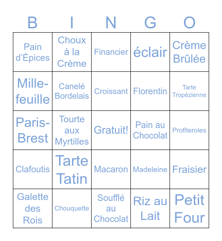 This bingo card has a free space and 24 words: Tarte Tatin, Chouquette, Croissant, Galette des Rois, Crème Brûlée, Pain d’Épices, Mille-feuille, Choux à la Crème, Pain au Chocolat, Macaron, Florentin, Paris-Brest, Madeleine, Fraisier, Canelé Bordelais, Riz au Lait, Profiteroles, Financier, Tarte Tropézienne, Tourte aux Myrtilles, Petit Four, Clafoutis, éclair and Soufflé au Chocolat.