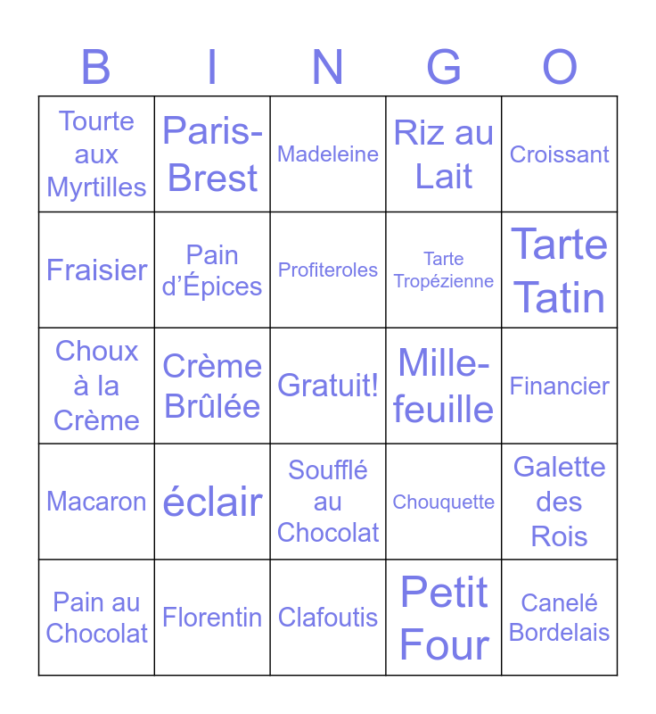 This bingo card has a free space and 24 words: éclair, Florentin, Profiteroles, Pain au Chocolat, Croissant, Tourte aux Myrtilles, Fraisier, Paris-Brest, Mille-feuille, Soufflé au Chocolat, Tarte Tropézienne, Choux à la Crème, Chouquette, Galette des Rois, Pain d’Épices, Petit Four, Financier, Madeleine, Tarte Tatin, Crème Brûlée, Canelé Bordelais, Macaron, Riz au Lait and Clafoutis.
