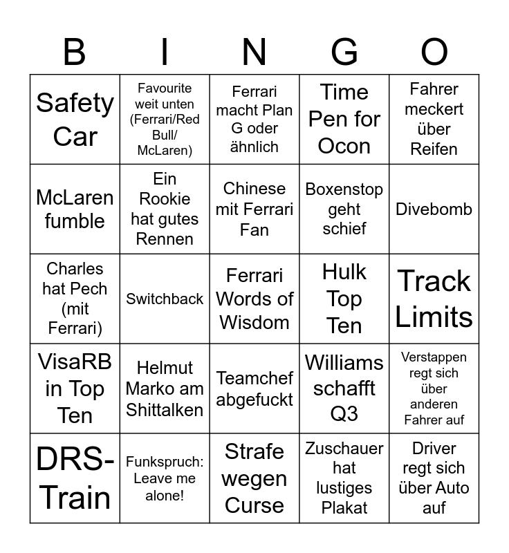 This bingo card has a free space and 24 words: Helmut Marko am Shittalken, Funkspruch: Leave me alone!, Chinese mit Ferrari Fan, DRS-Train, Fahrer meckert über Reifen, Safety Car, McLaren fumble, Favourite weit unten (Ferrari/Red Bull/ McLaren), Hulk Top Ten, Teamchef abgefuckt, Boxenstop geht schief, Charles hat Pech (mit Ferrari), Williams schafft Q3, Verstappen regt sich über anderen Fahrer auf, Ein Rookie hat gutes Rennen, Zuschauer hat lustiges Plakat, Track Limits, Ferrari macht Plan G oder ähnlich, Divebomb, Switchback, Driver regt sich über Auto auf, VisaRB in Top Ten, Time Pen for Ocon and Strafe wegen Curse.